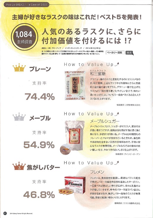 | 2014/12/26 | ベーカリーパートナー12月号「主婦が好きなラスクの味はこれだ!ベスト5を発表」に掲載されました。 |